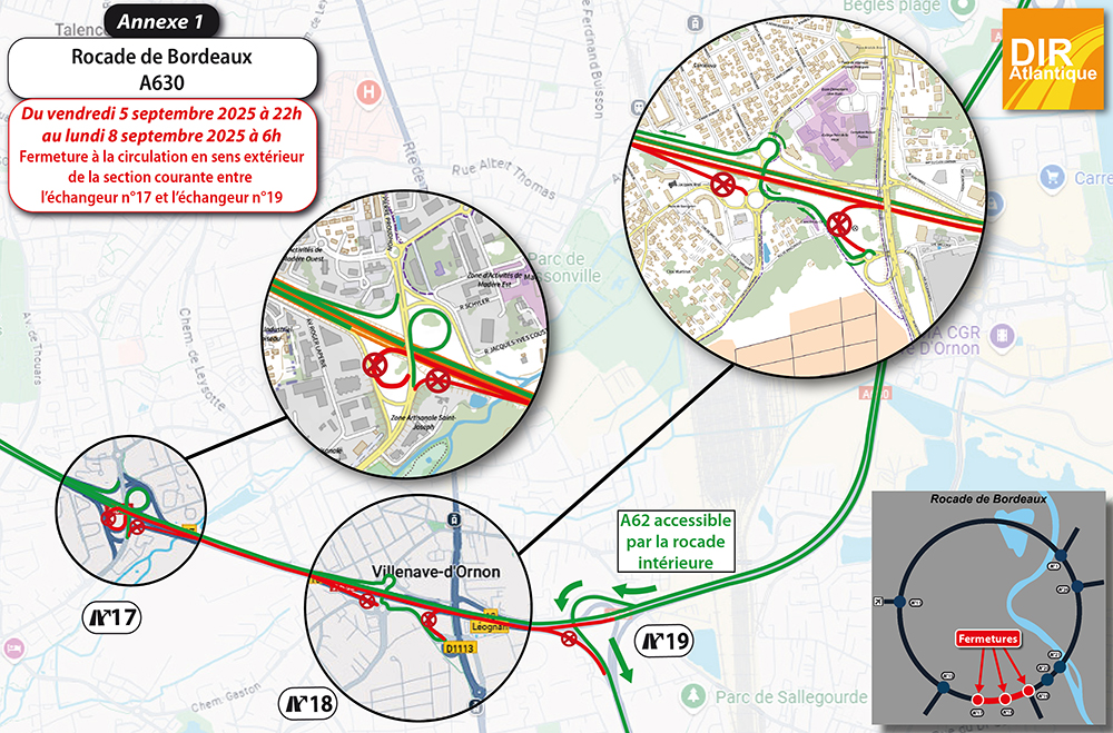 Les travaux de finition et de réalisation de la couche de roulement, nécessitent la fermeture de la rocade extérieure entre les échangeurs 17 (Chanteloiseau) et 19 (A62) du vendredi 5 septembre à 22h au lundi 8 septembre à 6h (annexe 1).